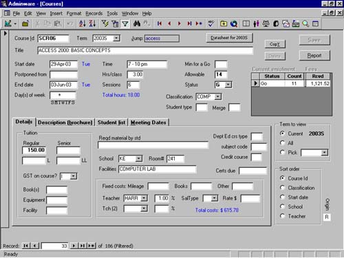 - current enrollment and fees received for each course are noted on the