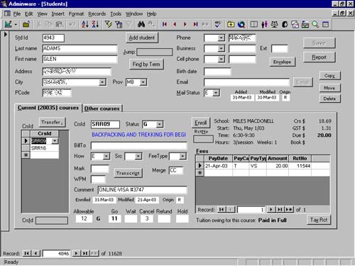 screen. Enrollment in specific courses and fee payments are recorded here.