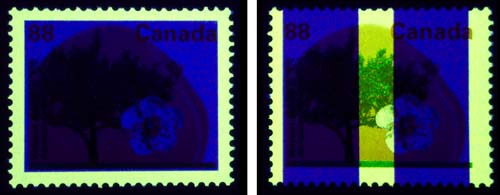 "General" tagging began to replace the Winnipeg tagging in 1972. It is sometimes been referred to as "Ottawa" tagging. This tagging has no afterglow associated with it. The first general tagging is called "OP-4", its technical term, and one that has been used more frequently in recent years. OP-4 tagging has a brilliant yellow colour, faintly tinged with green. Another distinguishing feature is that it "migrates" - the tagging material will bleed across the stamp, and onto other stamps and materials that are in contact with the tagging for prolonged periods. OP-4 tagging was superseded by OP-2 tagging in 1972. Some stamps in the Centennial definitives and medium-value Landscape definitives exist with both OP-4 and OP-2 taggings. OP-2 tagging was an improved "version" of "General/Ottawa" tagging. It does not migrate as does OP-4 tagging. In its early stages in the Centennial definitive-era, OP-2 tagging shows widely different shades, from a full, rather deep, yellow, to light yellow, to cream and to ivory. It does not show the brilliance of OP-4, nor does it show the greenish tinge. During the Centennial and Landscape eras, the edges of OP-2 bars appear straight and clean-cut, whereas the edges of OP-4 tag bars are blurred (due to the migration into the adjacent paper of the stamp). During the Landscape era, 2 different widths of tag bars were used - this is an important criteria for identifying different printings. During the Environment definitive era, the edge of the tag bars will be either straight and clean (on stamps printed by lithography), or appear very blotchy (on stamps printed by photogravure).