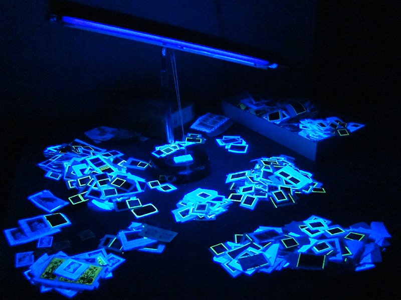 The UV light is a 'black tube' that fits into a goose-neck fluorescent-type lamp. This keeps both of my hands free for sorting/checking stamps. This type of light works extremely well for Canadian stamps (long wave) but it does not detect US tagging (short wave). Important: keep your eyes protected; wear prescription eye glasses or some other form of suitable eye protection. Work in a window-less room where the light can be turned off and provide complete darkness. Here are the different piles highlighted in the above image: 1. stamps to be checked (a bag sits on the floor and I bring out a handful at a time). 2. discard pile; those stamps that have been checked and nothing important was found. These will be given to children in a school stamp club which they will use to learn how to soak. 3. tagging errors that are found are placed on the base of the lamp. 4. I separate out, and keep, all Lowe-Martin coil stamps (flowers, olympics, animals) ... there are too many important die cutting varieties on these to discard any (except for damaged stamps). Also, the 50c Flower has both an important "ski slope" die cut variety and a rare "turquoise green background" variety, Unitrade 2072aiii (which needs to be checked with a short-wave UV light later). 5. Canadian commemoratives are separated. 6. Canadian definitives are separated. 7. foreign stamps are separated (USA definitives/Christmas are 'discarded'). 8. any 1c Traditional Trade stamps are separated. Years ago I heard of a "green thumb" variety that was thought to be constant. I have yet to find one, but the hunt continues. (this listing was just removed from the Unitrade as it is thought to not be constant) 9. after checking a couple of handful of stamps, the separated piles (4-7) are then moved from the table into the box. Looks like I am going to need a bigger box! Actually, these stamps will be removed from here shortly and placed in other storage boxes and/or soaked and then looked at more closely. Here is what the table looks like in the dark with the UV light on: